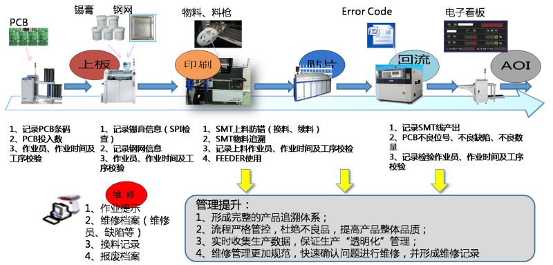 從客戶下單、物料采購(gòu)、材料入庫(kù)、SMT貼片加工、COB邦定、后焊插件 、AOI、QC和出庫(kù)等各個(gè)生產(chǎn)環(huán)節(jié)的數(shù)據(jù)進(jìn)行實(shí)時(shí)采集,對(duì)數(shù)據(jù)進(jìn)行跟蹤、管理與統(tǒng)計(jì)分析。從而進(jìn)一步幫助企業(yè)將工廠生產(chǎn)網(wǎng)絡(luò)化、透明化、無紙化以及精細(xì)化落地,做到產(chǎn)品可溯源。